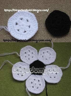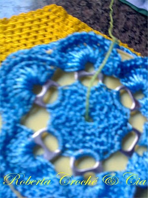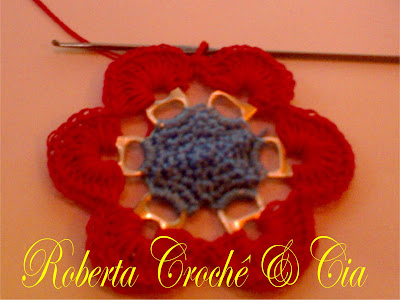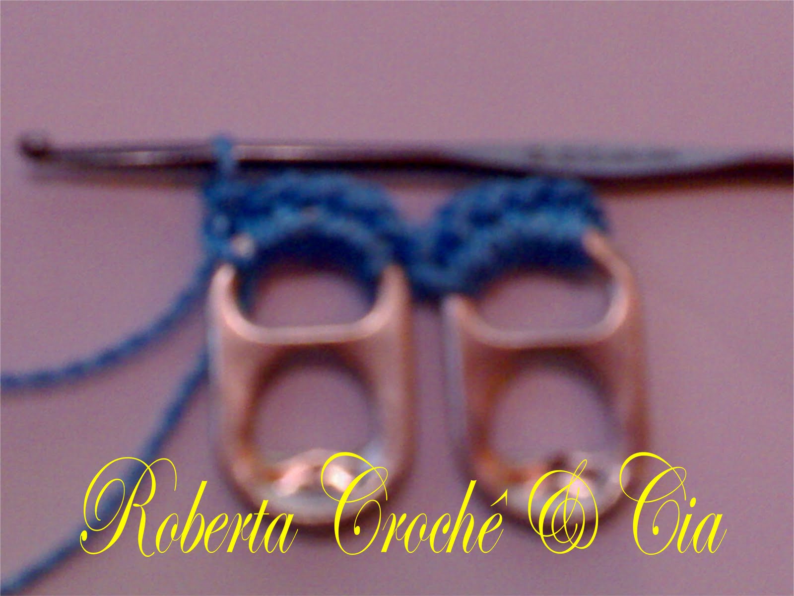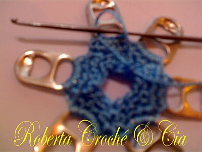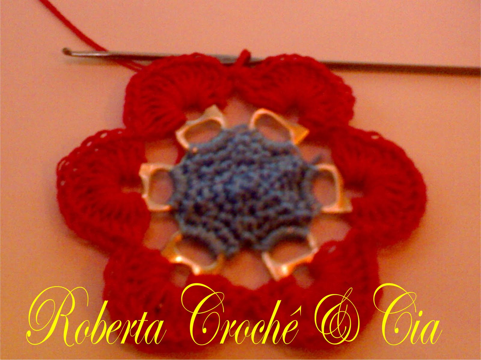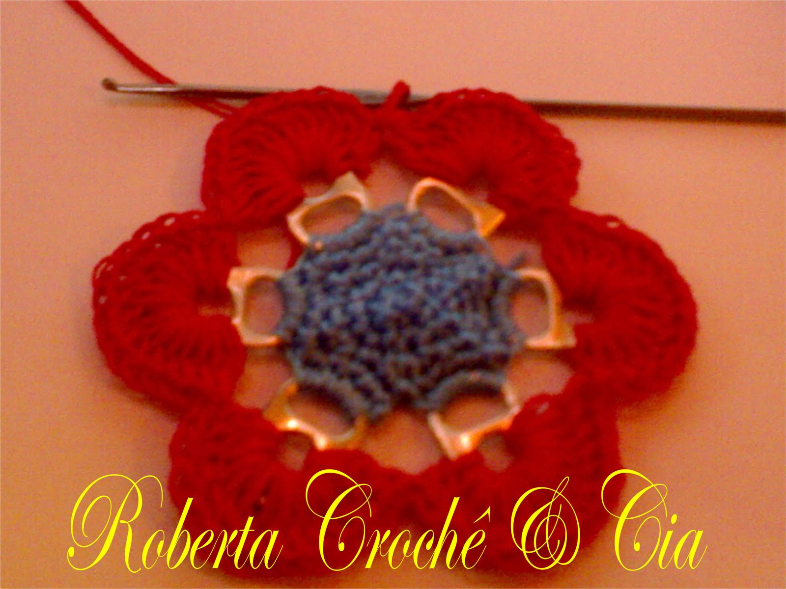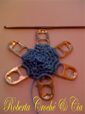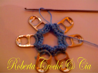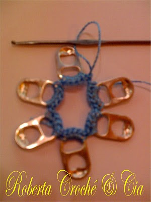 Para fazer as pétalas você faz 15 pontos altos em cada lacre até juntar a primeira a ultima pétala.