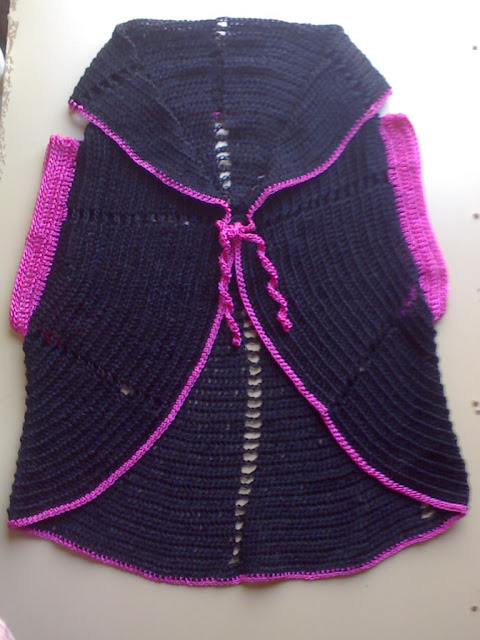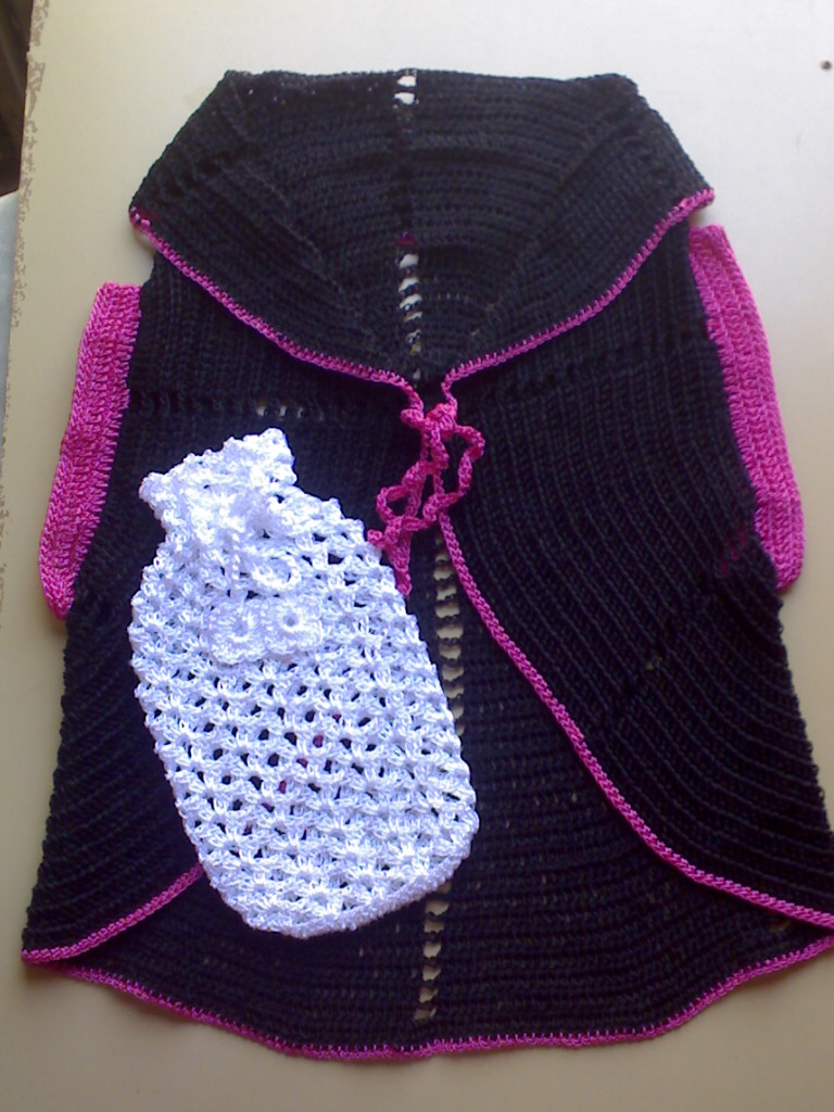 1- Depois que terminar a parte da frente, arrematar a linha virando a peça e recomeçar na parte que iniciou o trabalho. Subir com 5 correntinhas, pular 2 pontos de base, fazer 1 ponto alto no terceiro ponto. Fazer 2 correntinhas, depois fazer 1 ponto alto no terceiro ponto de base, sucessivamente até terminar.